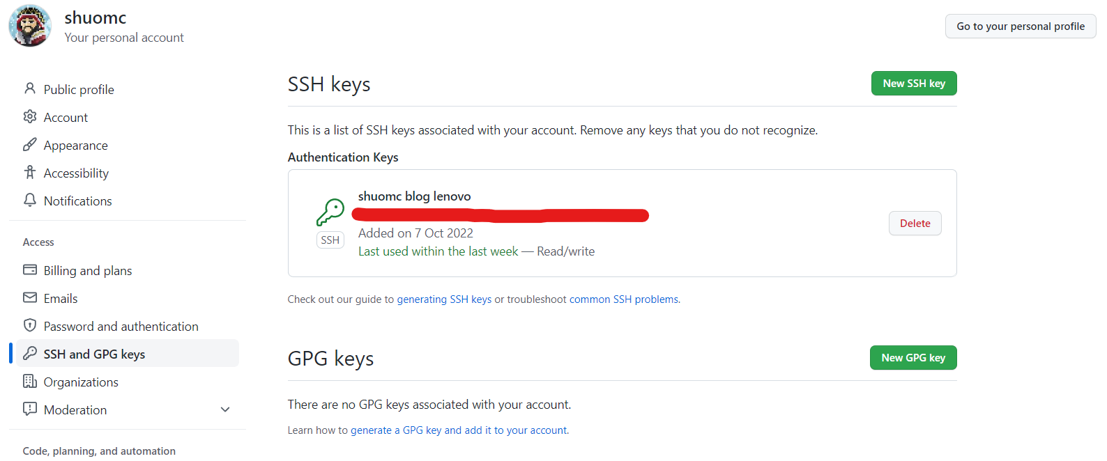 点击New SSH key